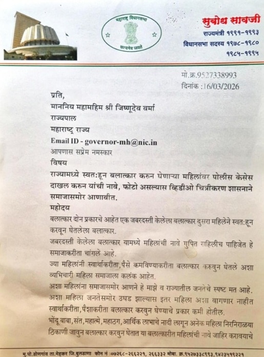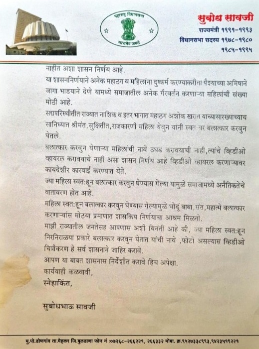Shocking Letter To Governor of Maharashtra: स्वतःहून बलात्कार करून घेणाऱ्या महिलांची नावे आणि व्हिडिओ जाहीर करा! अशी धक्कादायक मागणी माजी मंत्री सुबोध सावजी (Subodh Saoji) यांनी केली आहे. सुबोध सावजी यांनी राज्यपाल जिष्णूदेव वर्मा यांना यासंदर्भात एक पत्र पाठवलं असून या पत्रामुळे एकच खळबळ उडाली आहे. महाराष्ट्राचे महसूल राज्यमंत्रीपद भूषवलेले बुलढाणा जिल्ह्यातील मेहकर-लोणार मतदारसंघातून तीन वेळा आमदार राहिले सुबोध सावजी अडचणीत आले आहेत.