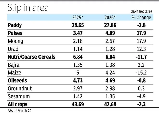 According to the weekly update released by the Agriculture Ministry, paddy sowing was down 3 per cent at 27.86 lh from 28.65 lh, while nutri/coarse cereals area was 12 per cent down at 6.04 lh against 6.84 lh year-ago. Among the nutri/coarse cereals, maize area is 15 per cent lower at 4.24 lh from 5 lh, while bajra has reached at 1.38 lh against 1.35 lh, both ragi and jowar at 0.20 lh, each as on March 20.
