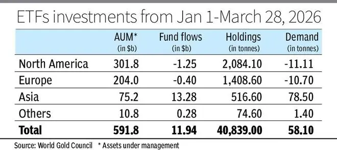 For every dollar inflow in physically-backed goldexchange-traded funds (ETFs) in March, there was an outflow of $2.3, according to data from the World Gold Council (WGC).