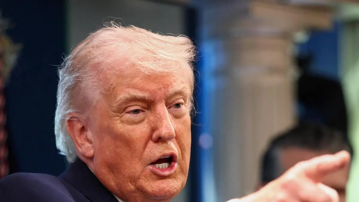 U.S. President Donald Trump, flanked by Secretary of Defense Pete Hegseth, gestures as he speaks during a press conference in the James S. Brady Press Briefing Room at the White House in Washington, D.C., U.S., April 6, 2026.